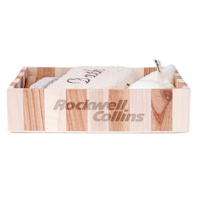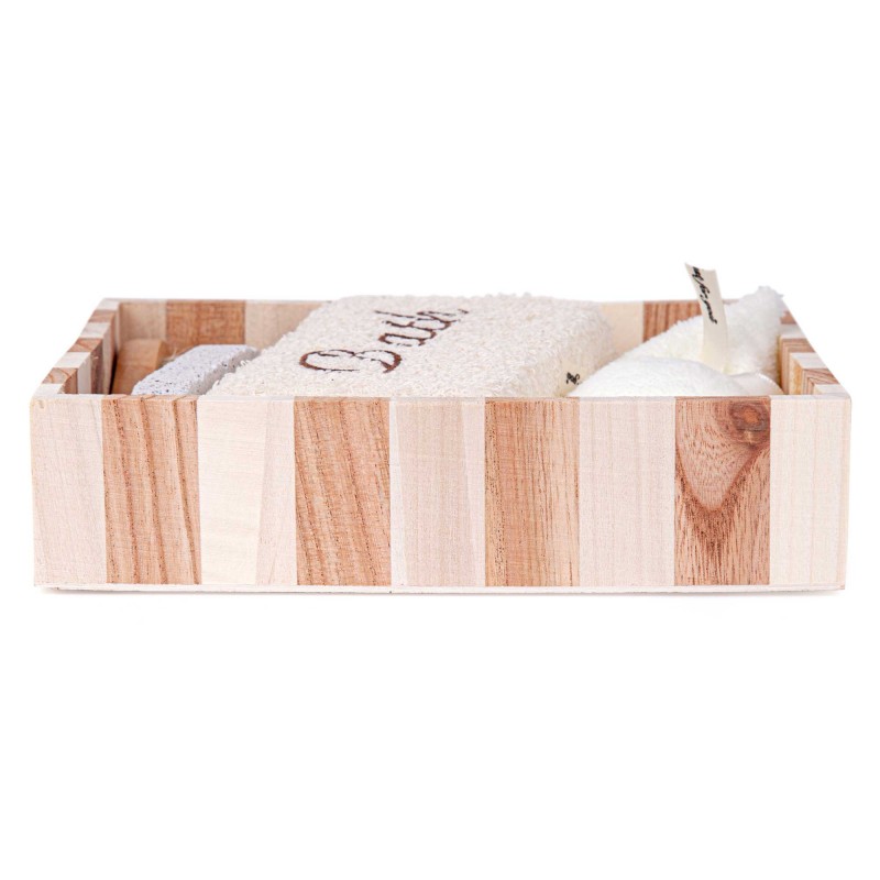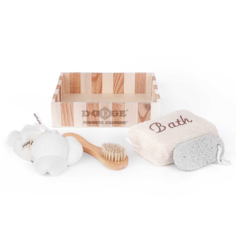 A 4-piece bath set presented in a beautiful two-tone wooden case. Features a bath towel, soft sponge, brush and pumice stone.