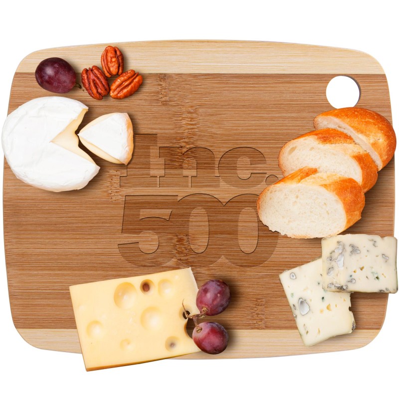 Enjoy long-lasting quality with this large sustainable bamboo cutting board. The board is beautifully presented in a two-tone coloration and is laser engraved for a durable imprint. Also great as a serving tray.