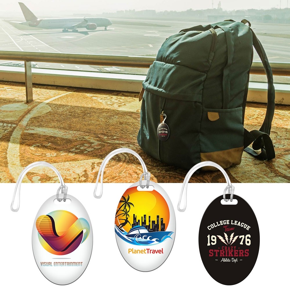 • Full Color Digital Printed bag tag.• 30 mil (1/32 inch) thick styrene plastic with a matte finish.• Made in USA.• Clear loop strap (Unattached) – tag, loop, and are bulk packged.