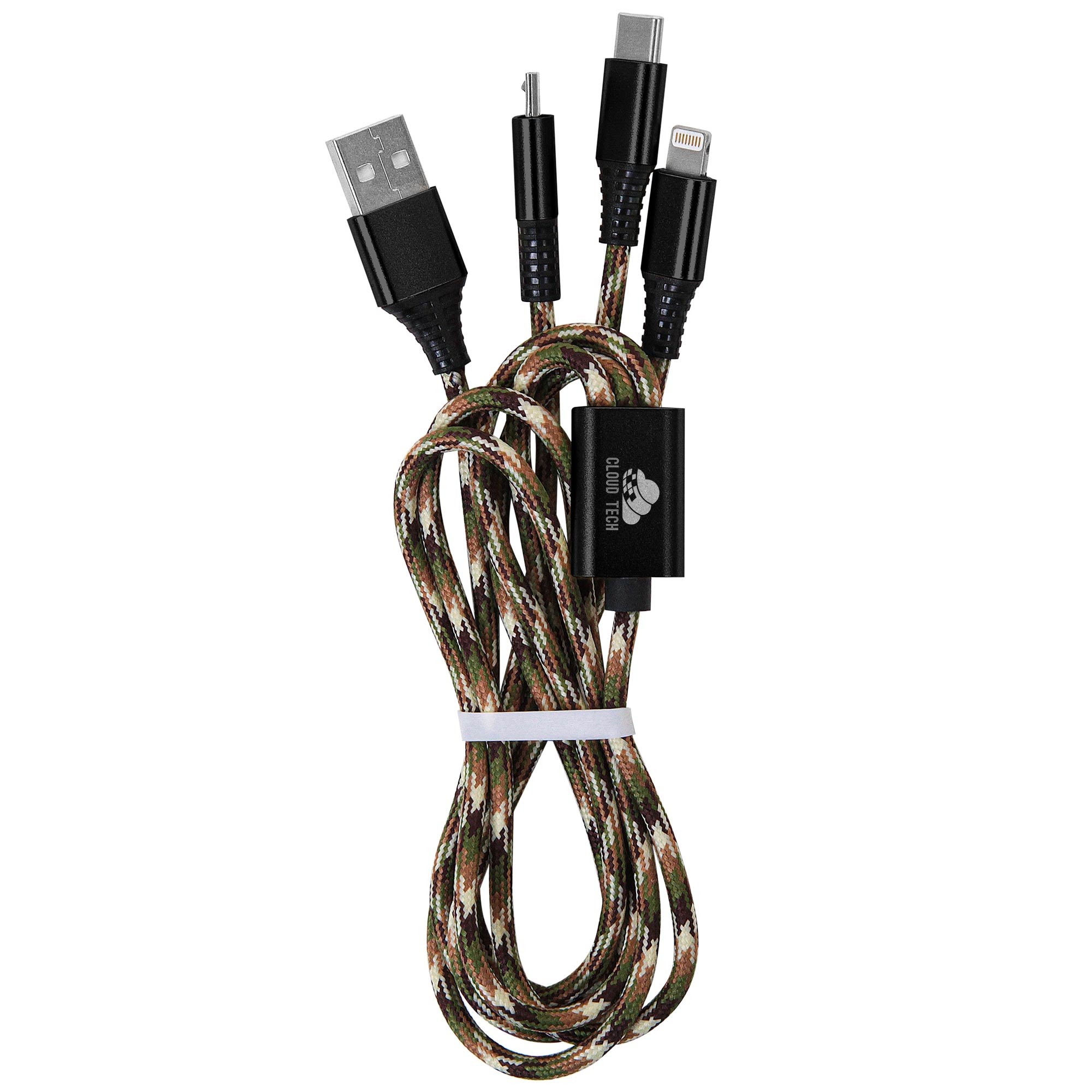 • The 3-foot cable includes a USB on one end with lightning, micro USB and Type-C connections on the other end.
