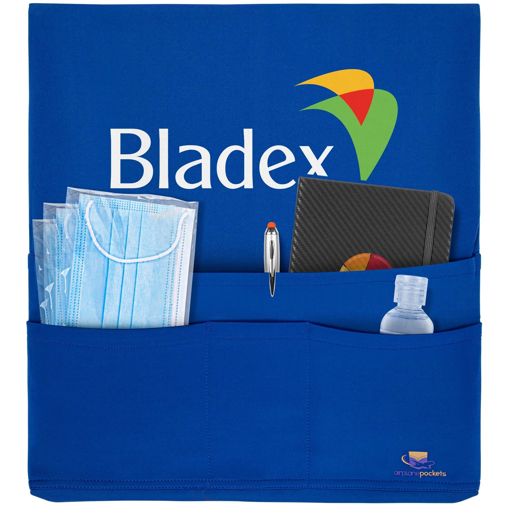 The Ionshield™ Airplane Pocket is a stretchable cover for airplane tray tables and has four expandable pockets with plenty of room to hold a laptop computer, water bottle, phone, eyeglasses and much more. It is reusable, washable and durable. It is patented and best of all, it has one of the largest surfaces of any other promotional product for corporate logos! With everyone concerned about germs, there is no need to touch the tray table because Airplane Pockets cover both sides of the tray giving you a clean surface to eat and work on with the added power of Ionshield™. INSTRUCTIONS INCLUDED.