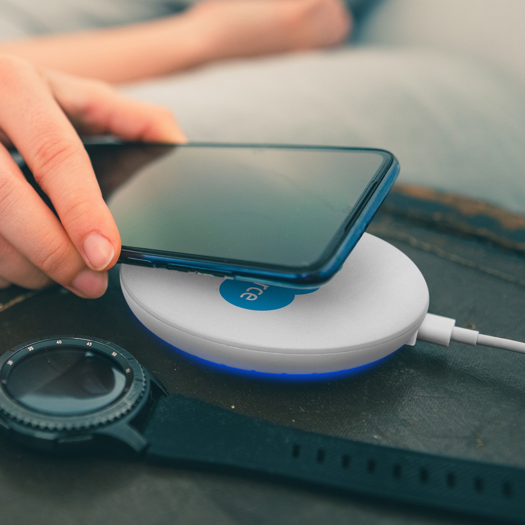 • Soft blue LED light on the charger underside.